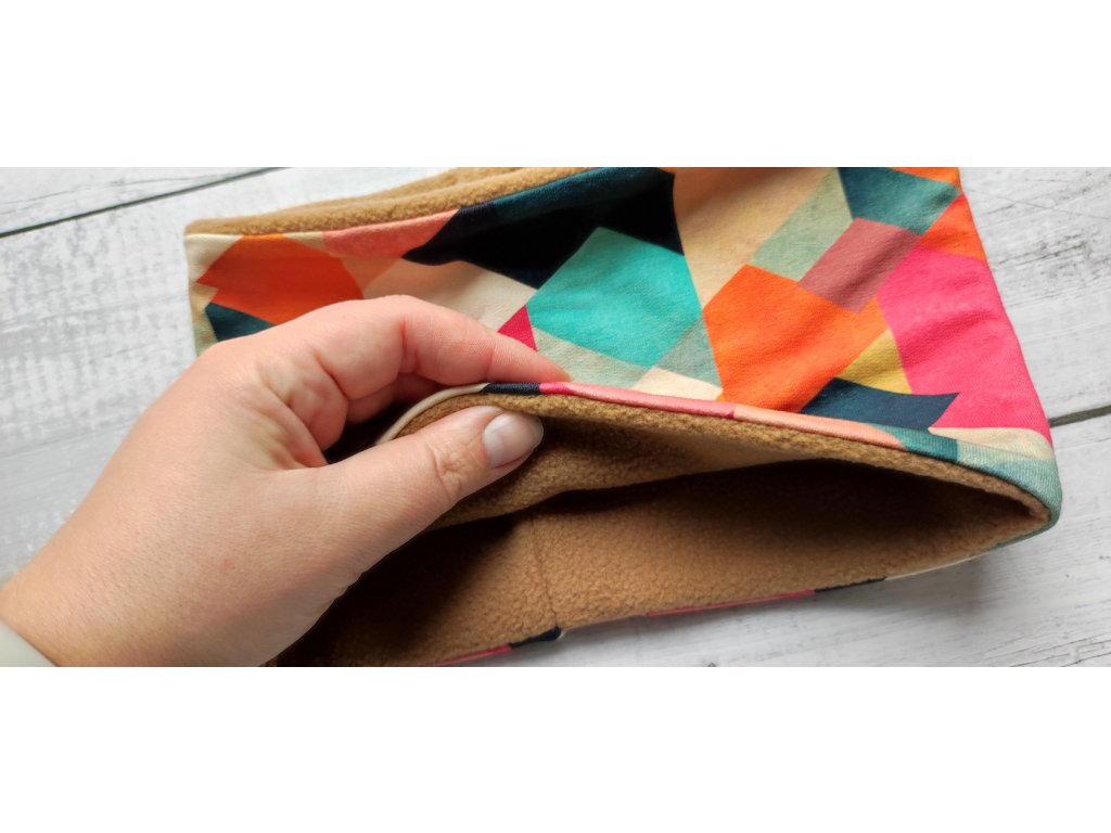 Horní vrstva nákrčníku je bavlněné teplákoviny (95 % bavlna, 5 % elastan) vnitřní část je z fleecu ( 100 % polyester). K nákrčníku si můžete objednat také čepici jak v zateplené variante (s fleecem), tak v nezateplené variantě ( bavlněný úplet).