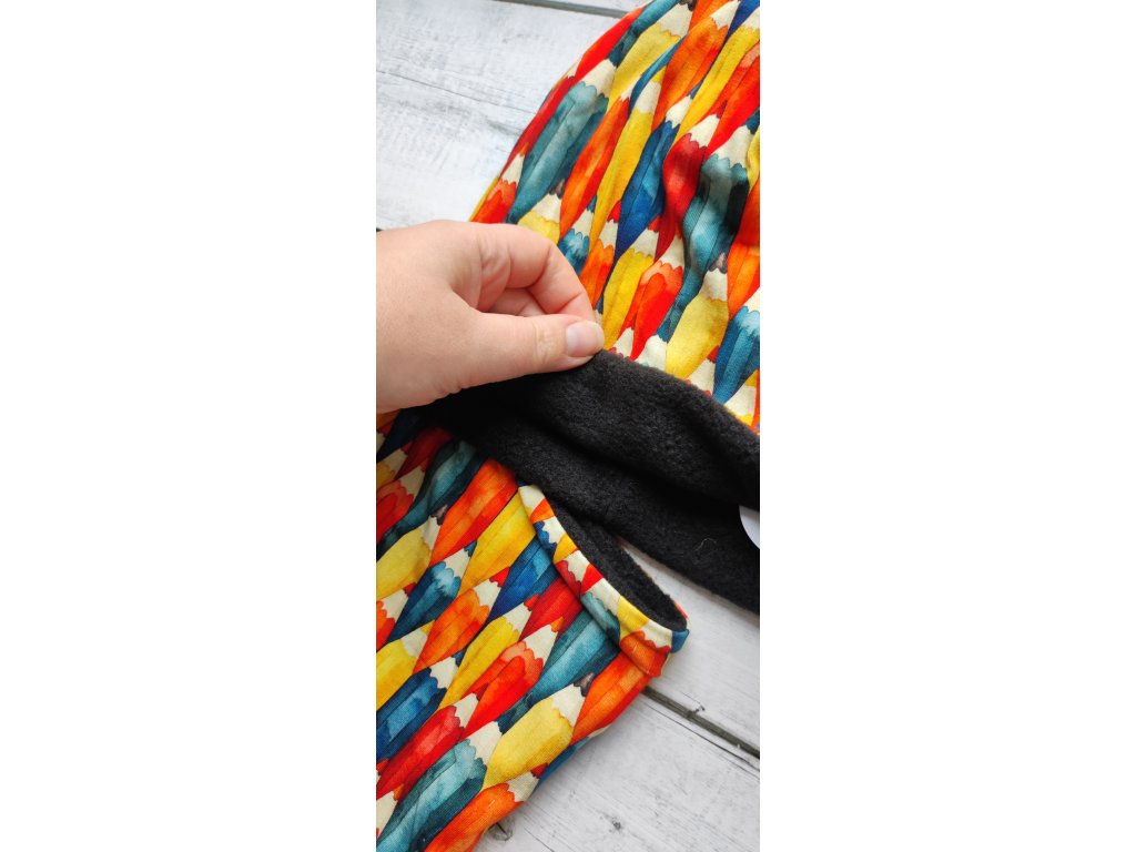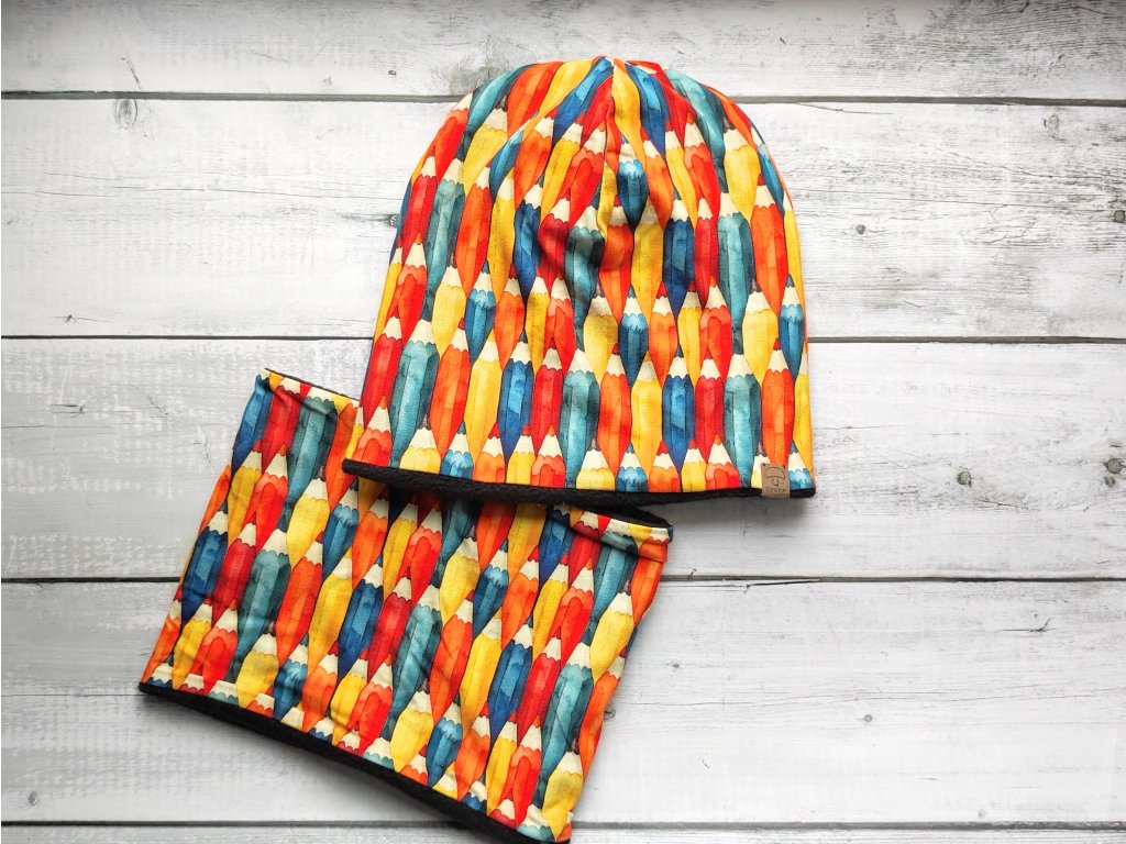 Zimní set, který obsahuje zateplenou čepici a nákrčník. Oba kusy jsou ušité z teplákoviny a fleecu. Střihem je jedná o tzv. homelessku. Díky zateplení je set ideální do zimního počasí.