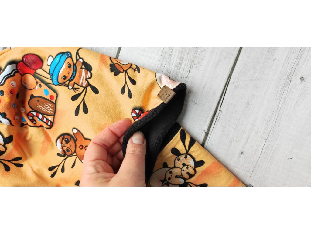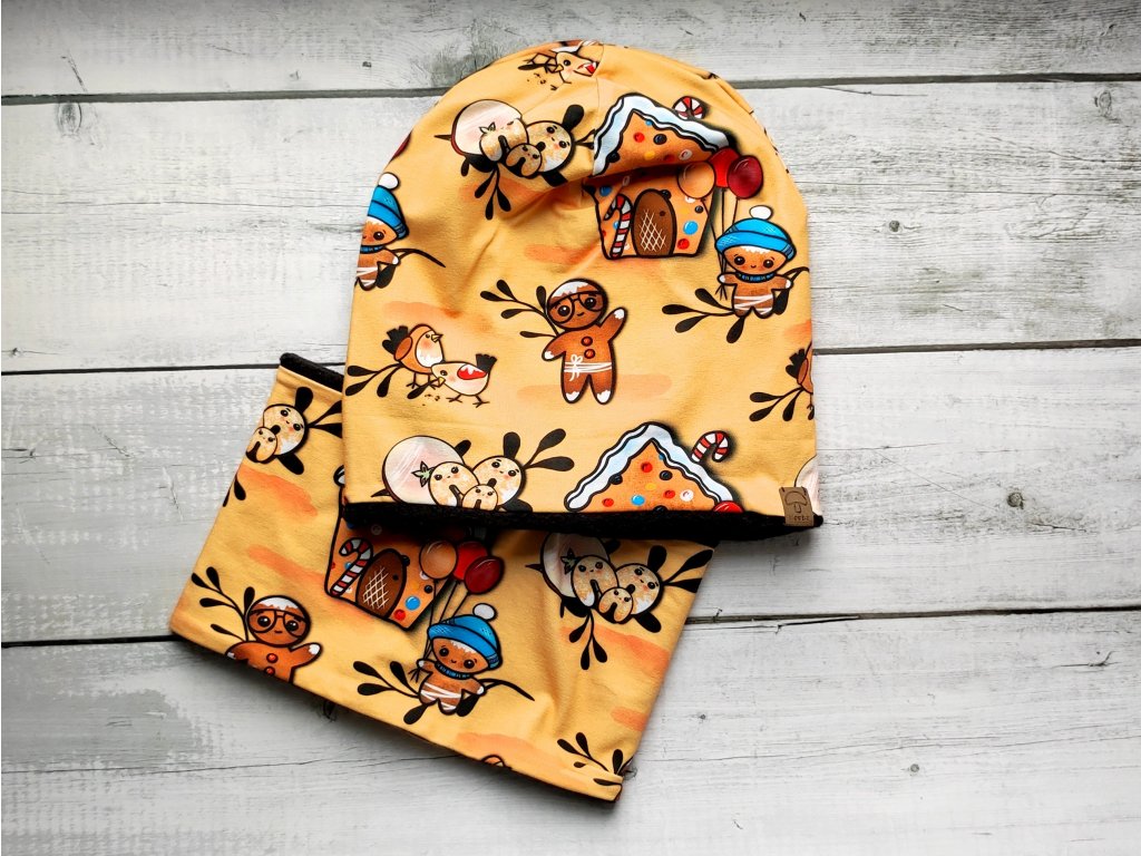 Zimní set, který obsahuje zateplenou čepici a nákrčník. Oba kusy jsou ušité z teplákoviny a fleecu. Střihem je jedná o tzv. homelessku. Díky zateplení je set ideální do zimního počasí.