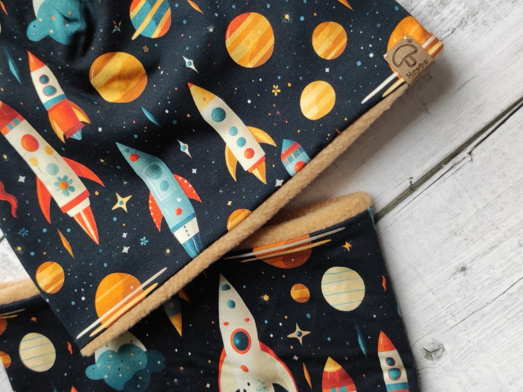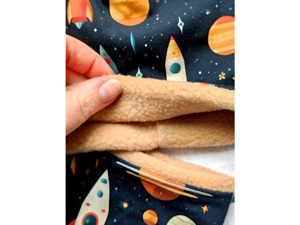 Zimní set, který obsahuje zateplenou čepici a nákrčník. Oba kusy jsou ušité z teplákoviny a fleecu. Střihem je jedná o tzv. homelessku. Díky zateplení je set ideální do zimního počasí.